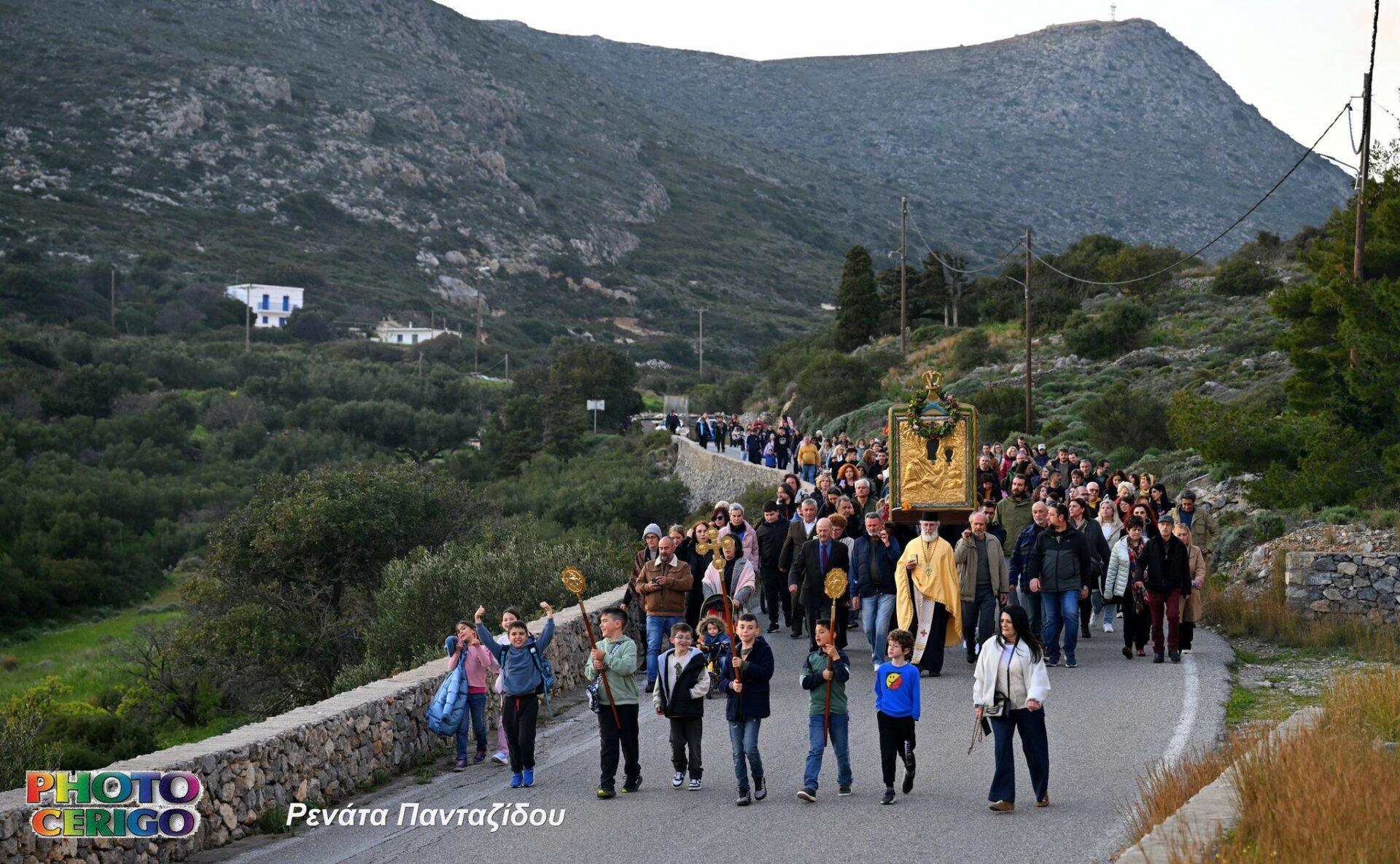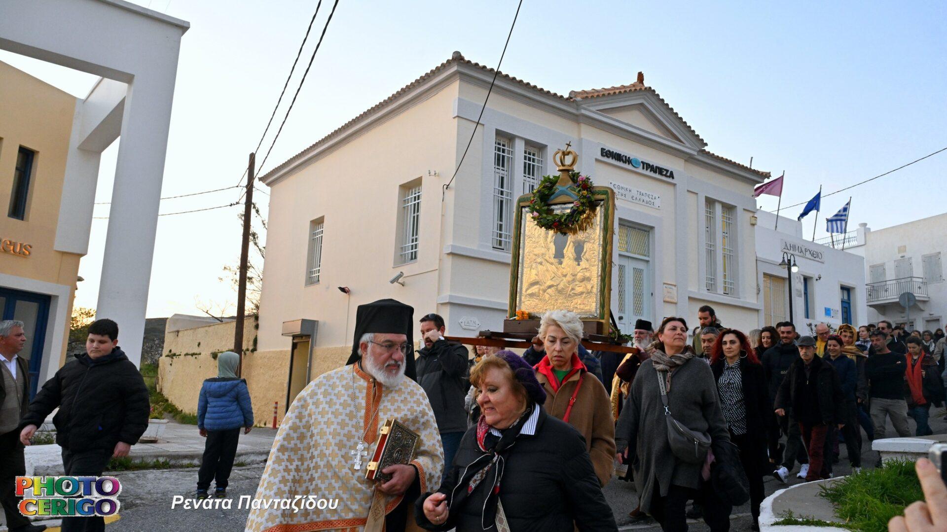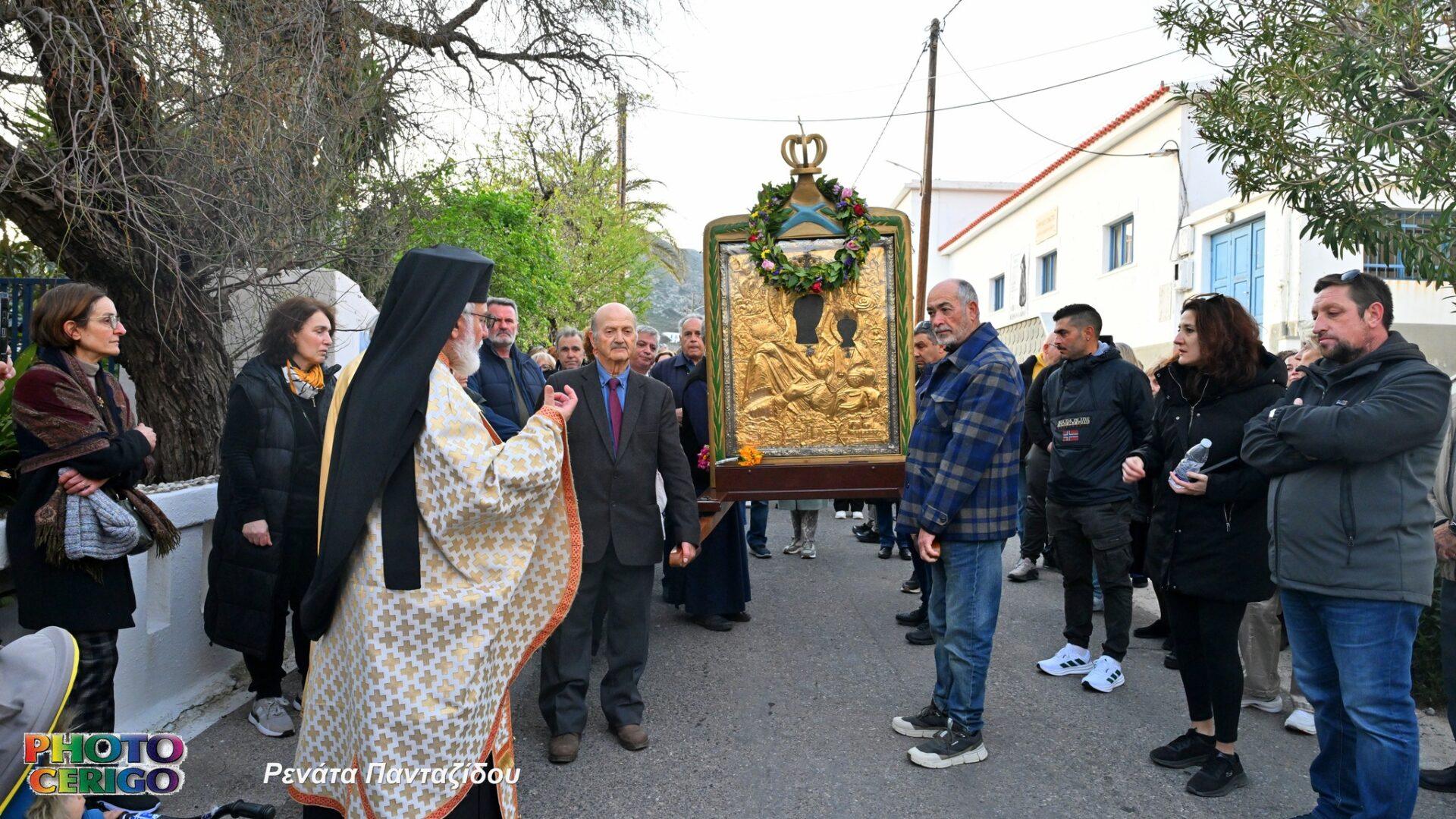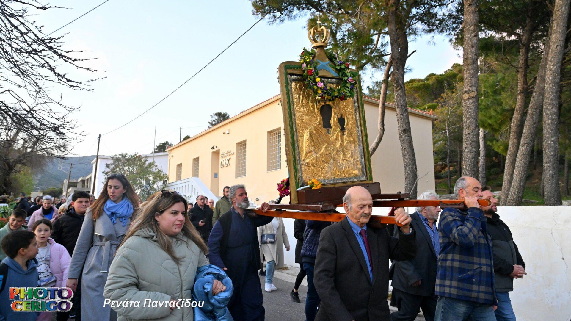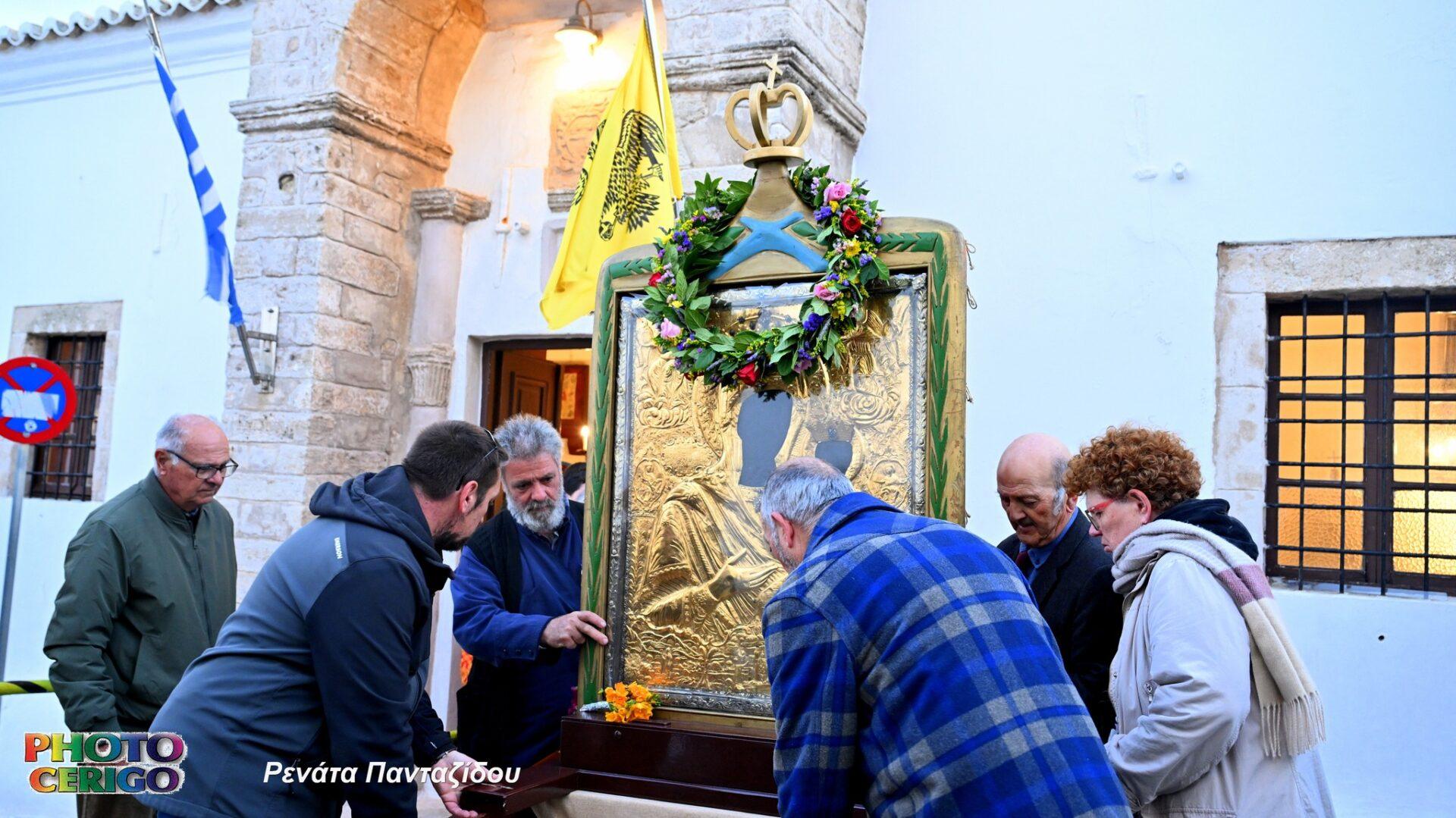 Σύμφωνα με την παράδοση του νησιού, η θαυματουργή Εικόνα μεταφέρεται από το Ιερό Προσκύνημα των Μυρτιδίων προς τη Χώρα και παραμένει εκεί έως και τη Δευτέρα του Πάσχα, οπότε και ξεκινά εκ νέου η καθιερωμένη περιφορά της σε όλα τα χωριά των Κυθήρων.