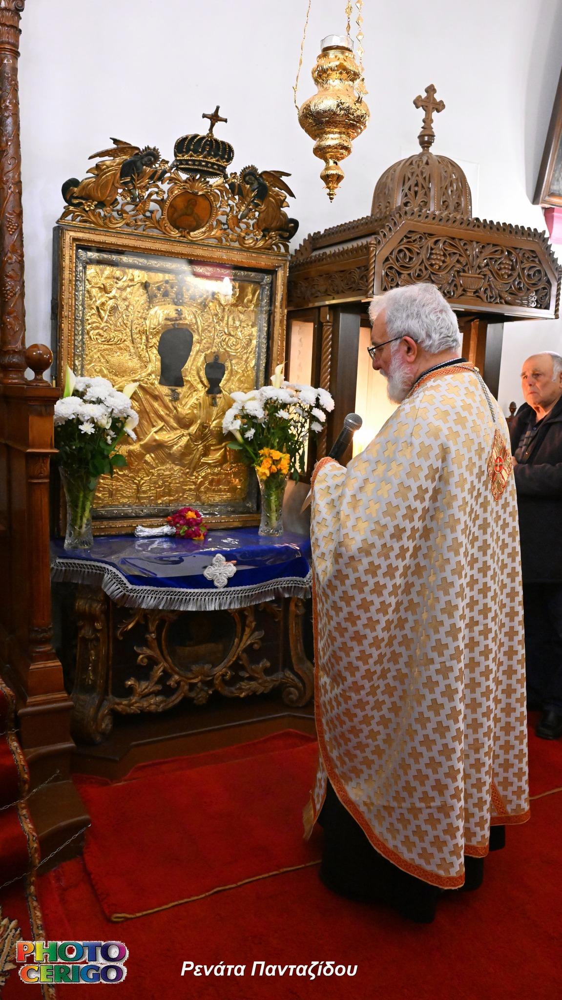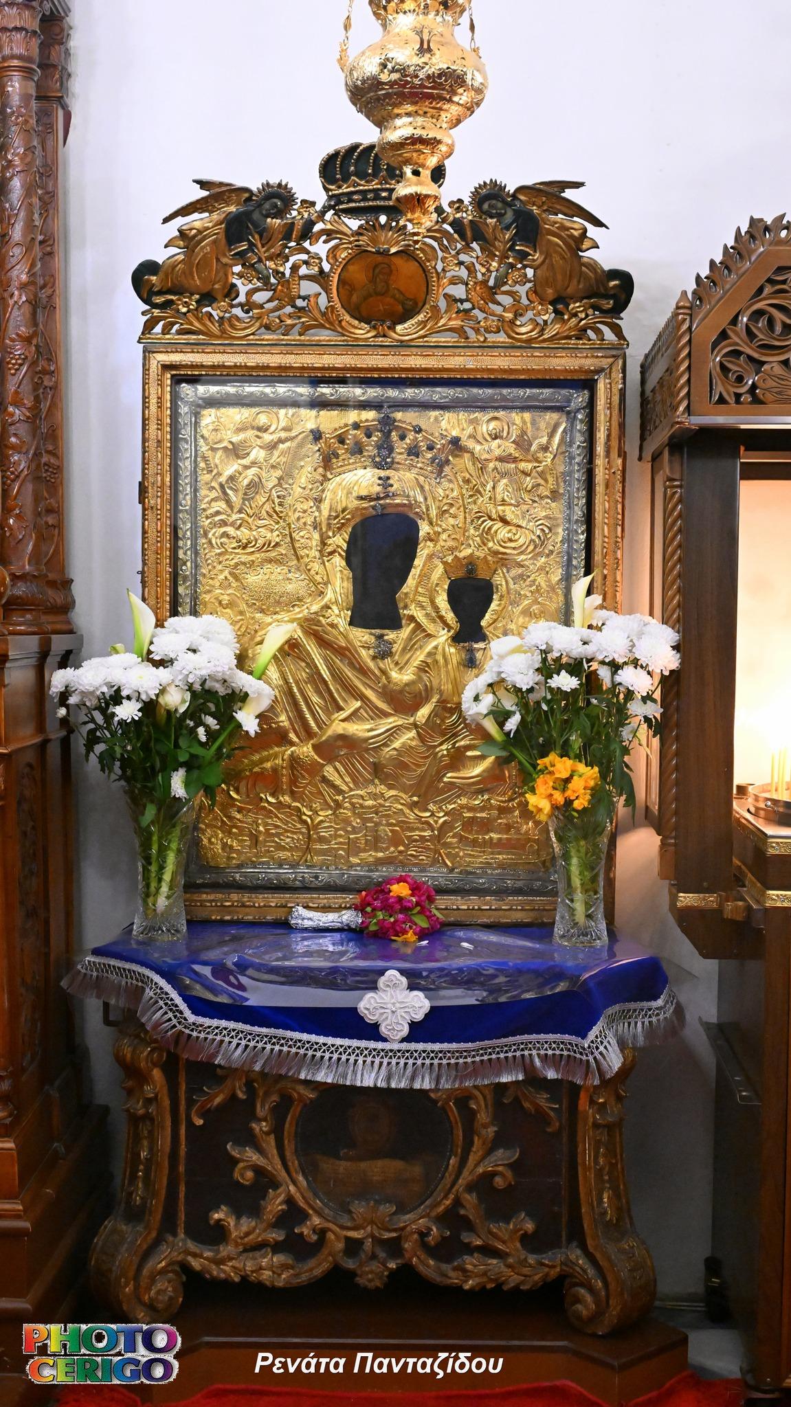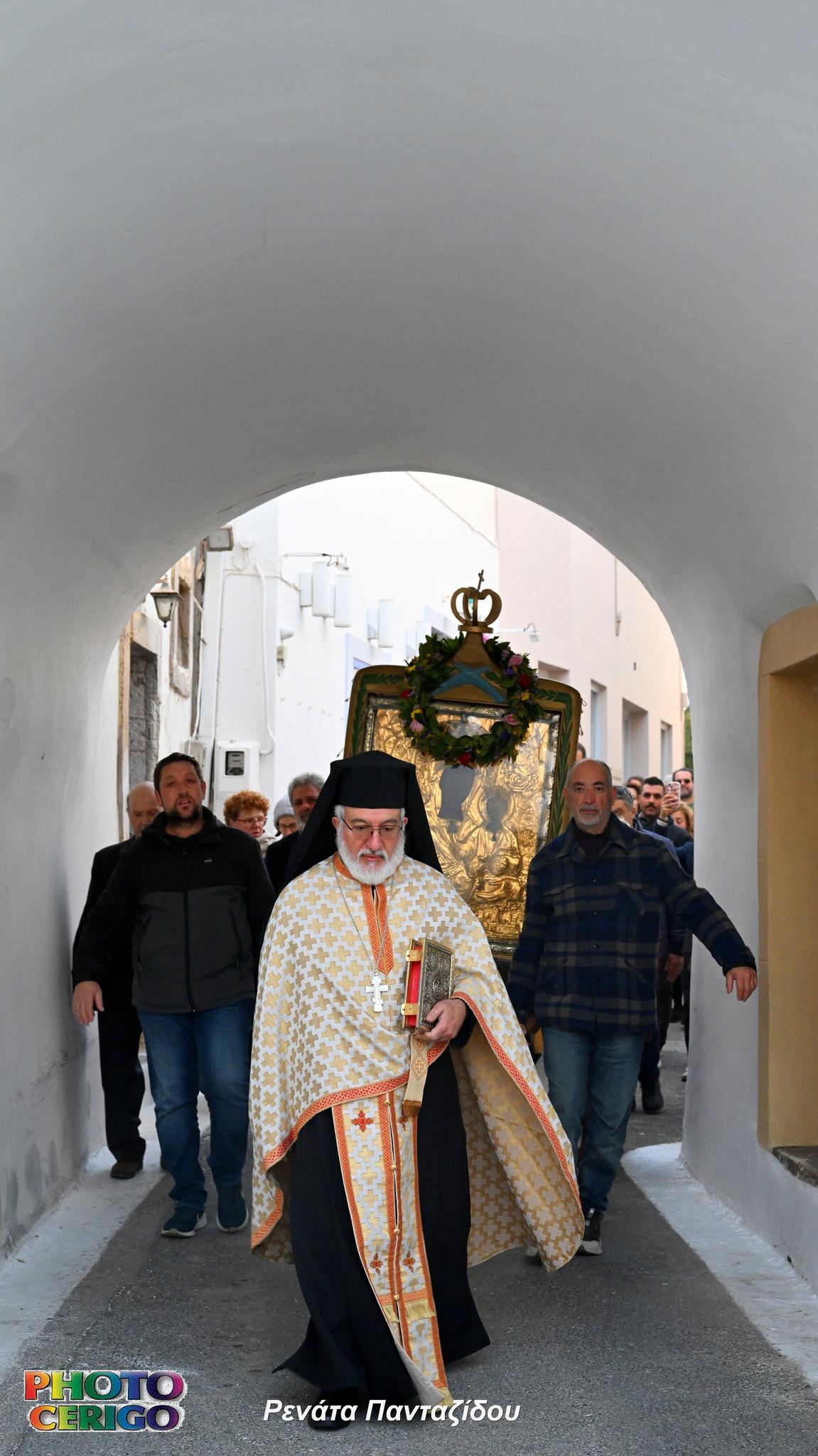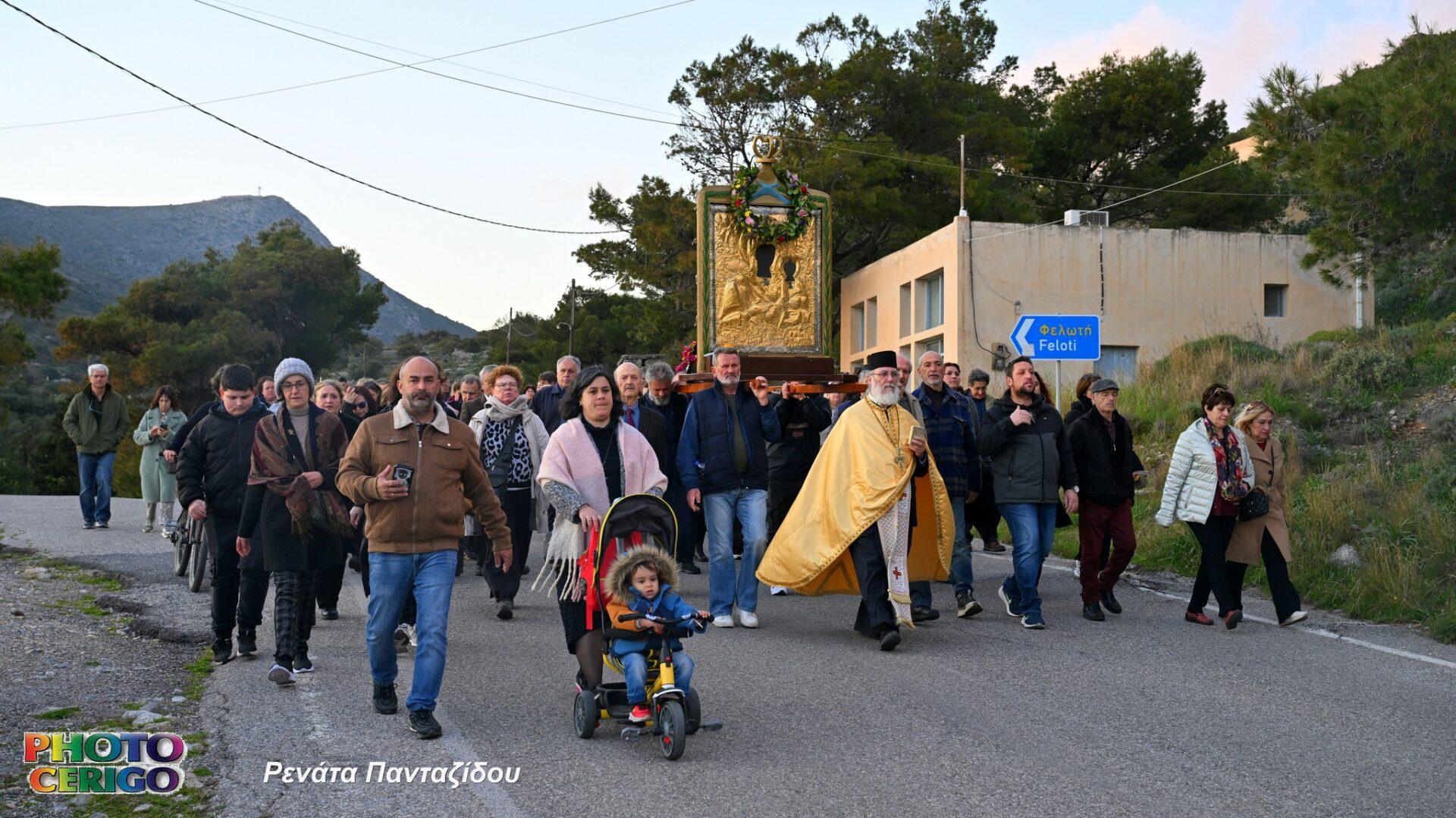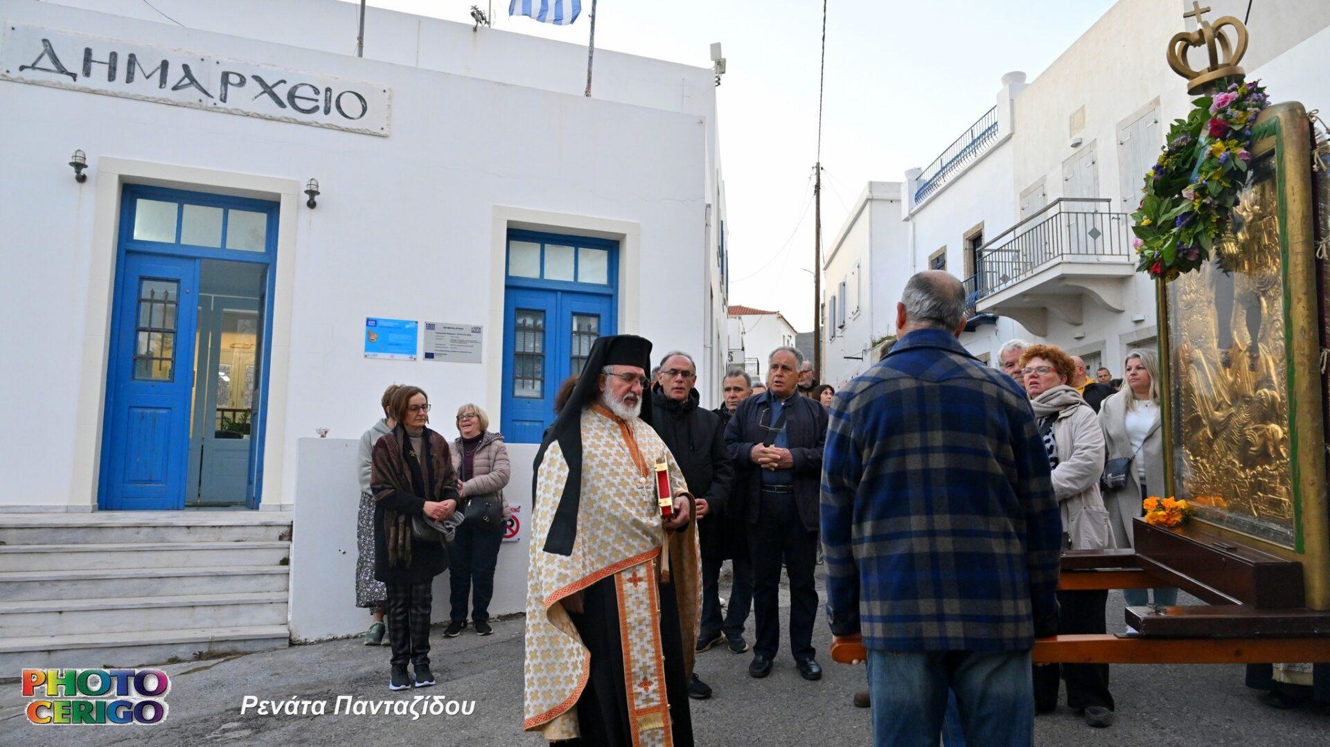 Σύμφωνα με την παράδοση του νησιού, η θαυματουργή Εικόνα μεταφέρεται από το Ιερό Προσκύνημα των Μυρτιδίων προς τη Χώρα και παραμένει εκεί έως και τη Δευτέρα του Πάσχα, οπότε και ξεκινά εκ νέου η καθιερωμένη περιφορά της σε όλα τα χωριά των Κυθήρων.