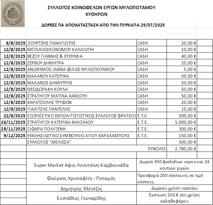 Ιδιαίτερες ευχαριστίες στους Φορείς και τους Συλλόγους των Κυθήρων που συνέβαλλαν οικονομικά στην ίδια προσπάθεια, αλλά και στους επαγγελματίες του νησιού για την εις είδος συνεισφορά τους.