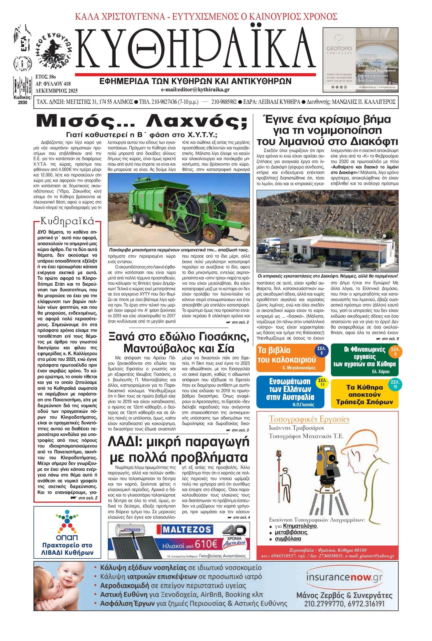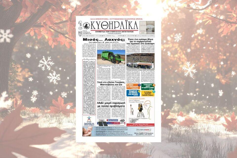 Κυκλοφόρησε το φύλλο Δεκεμβρίου 2025 της εφημερίδας «ΚΥΘΗΡΑΪΚΑ»