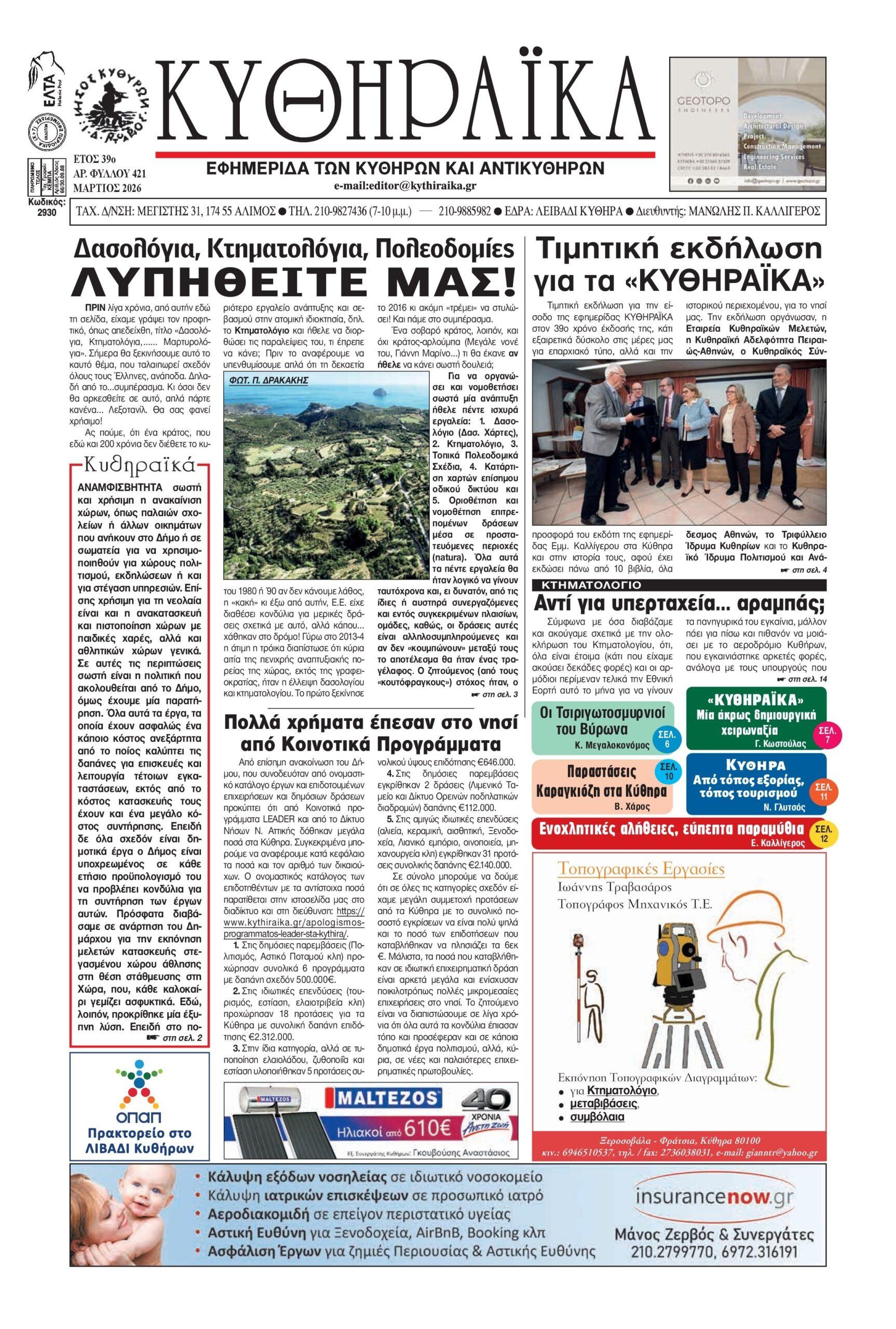 Κυκλοφόρησε το φύλλο Μαρτίου 2026 της εφημερίδας «ΚΥΘΗΡΑΪΚΑ»