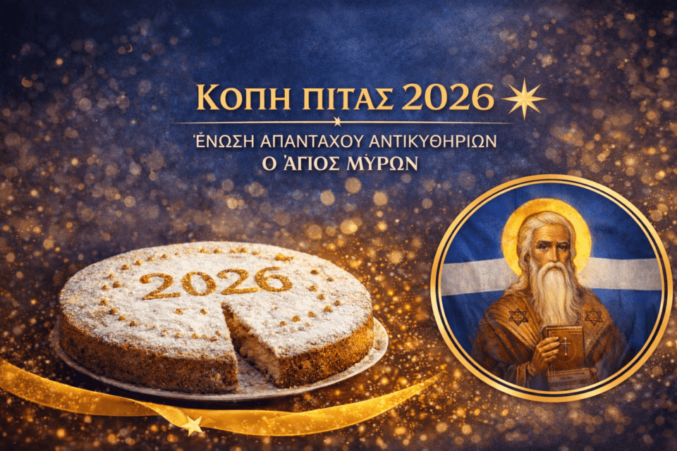 Το Διοικητικό Συμβούλιο της Ένωσης των Απανταχού Αντικυθηρίων «Ο ΑΓΙΟΣ ΜΥΡΩΝ» έχει την τιμή να σας προσκαλέσει στην κοπή της Πρωτοχρονιάτικης πίτας του Σωματείου για το έτος 2026, η οποία θα πραγματοποιηθεί την Κυριακή 08 Φεβρουαρίου 2026 και ώρα 10.30 – 11.00, στην αίθουσα εκδηλώσεων της Κυθηραϊκής Αδελφότητας Πειραιώς-Αθηνών επί της οδού Ναυαρίνου 7 (3ος όροφος) στον Πειραιά.
