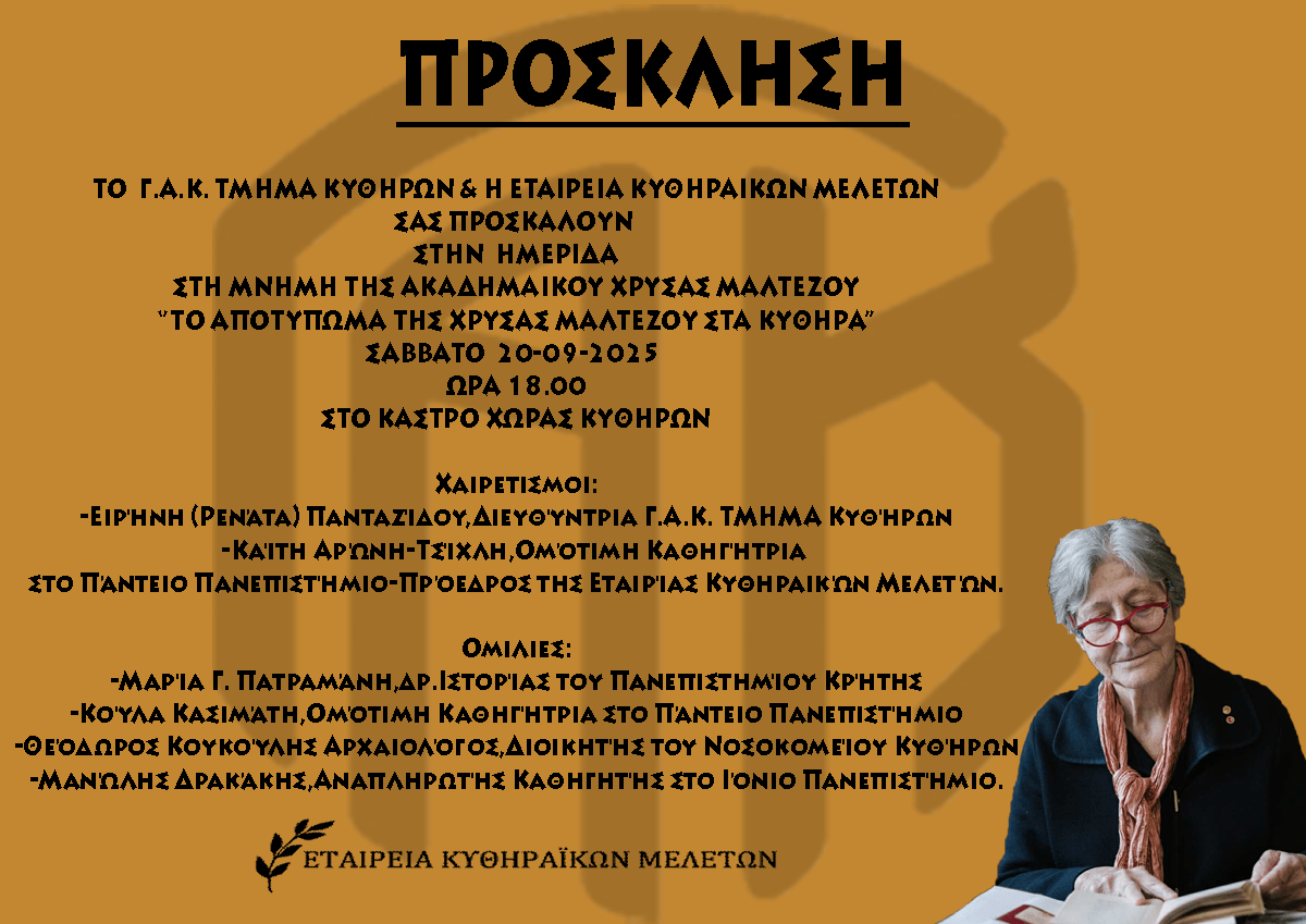σας προσκαλούν στην ημερίδα με τίτλο «Το αποτύπωμα της Χρύσας Μαλτέζου στα Κύθηρα»,