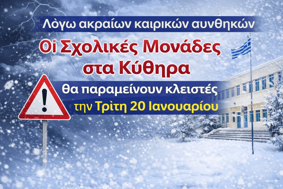 Λόγω των εξαιρετικά δυσμενών καιρικών συνθηκών που σύμφωνα με την ΕΜΥ προβλέπονται για τη Νήσο Κυθήρων (ριπές ανέμου άνω των 100χλμ/ώρα), όλες οι σχολικές μονάδες του νησιού (συμπεριλαμβανομένου του Παιδικού Σταθμού) θα παραμείνουν κλειστές κατά την Τρίτη 20 Ιανουαρίου 2026.