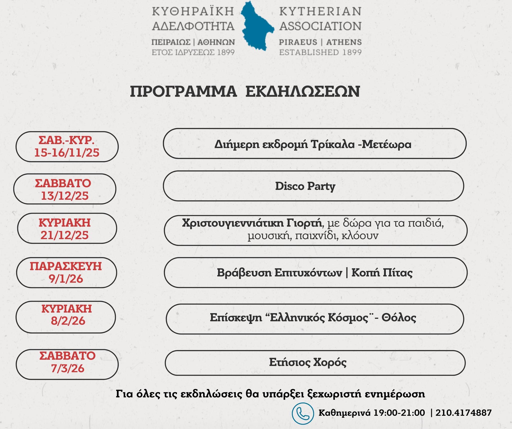 Η Κυθηραϊκή Αδελφότητα Πειραιώς δημοσίευσε το πρόγραμμα εκδηλώσεων, εκδρομών κι επισκέψεων, μέχρι και τις 7 Μαρτίου 2026.