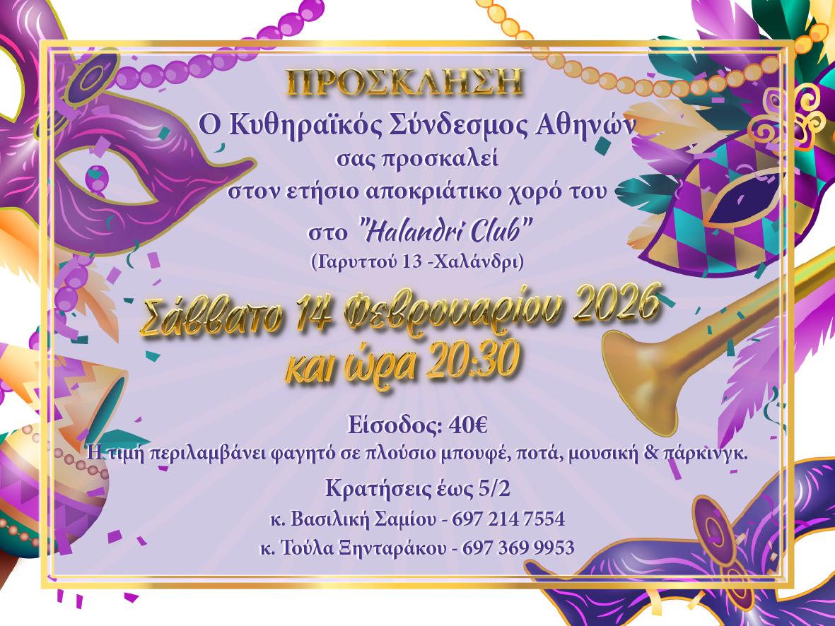 ΚύθηραΚυθηραϊκός Σύνδεσμος Αθηνών – Πρόσκληση στον ετήσιο χορό, το Σάββατο 14 Φεβρουαρίου 2026 Από Tsirigo FM17 Ιανουαρίου 202617.01.20260793 Πηγή: Κυθηραϊκός Σύνδεσμος Αθηνών