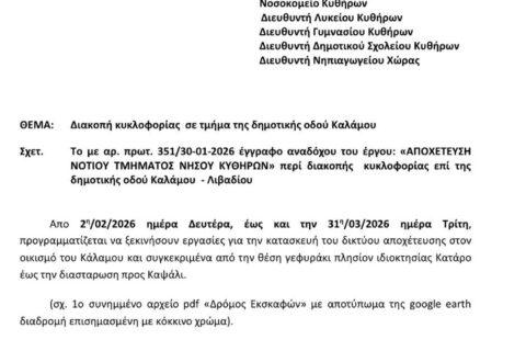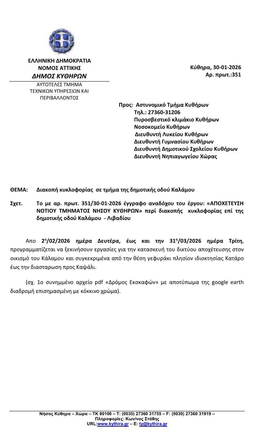 Σε συνέχεια του με αρ. πρωτ. 351/30.01.2026 εγγράφου του Αυτοτελούς Τμήματος Τεχνικών Υπηρεσιών και Περιβάλλοντος του Δήμου Κυθήρων, με το οποίο γνωστοποιείται προγραμματιζόμενη διακοπή κυκλοφορίας σε τμήμα δημοτικής οδού, σας επισημαίνω ότι, σύμφωνα με την κείμενη νομοθεσία, η διακοπή ή ρύθμιση της κυκλοφορίας σε δημοτικές οδούς δεν δύναται να πραγματοποιείται με απλή υπηρεσιακή ενημέρωση.