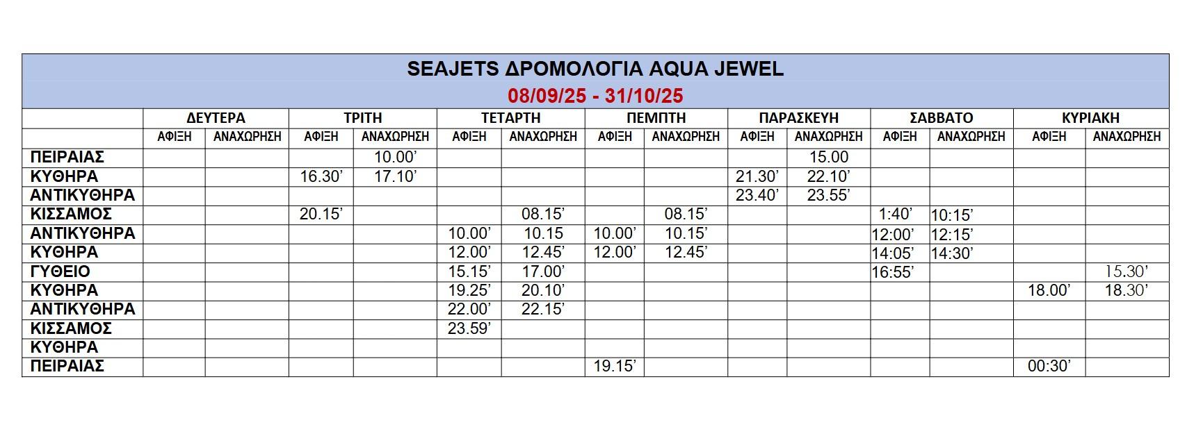 ΔρομολόγιαΚύθηραΠρόγραμμα δρομολογίων Ε/Γ-Ο/Γ AQUA JEWEL από 8 Σεπτεμβρίου έως 31 Οκτωβρίου 2025 Από Tsirigo FM10 Σεπτεμβρίου 202510.09.202501358Δείτε το πρόγραμμα δρομολογίων του Ε/Γ-Ο/Γ AQUA JEWEL, από τις 8 Σεπτεμβρίου έως τις 31 Οκτωβρίου 2025.Πηγή: Drakakis Tours Φωτογραφία αρχείου Παναγιώτη Μπαχτή – TSIIRIGO FM 105,6