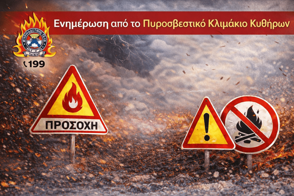 Το Πυροσβεστικό Κλιμάκιο Κυθήρων ενημερώνει τους πολίτες ότι, λόγω των θυελλωδών ανέμων που επικρατούν, απαγορεύεται κάθε υπαίθρια δραστηριότητα που ενδέχεται να προκαλέσει κίνδυνο εκδήλωσης ή εξάπλωσης πυρκαγιάς. Συγκεκριμένα απαγορεύεται αυστηρά η καύση υπολειμμάτων καλλιεργειών, κλαδιών ή άλλων υλικών στην ύπαιθρο, για όσο διάστημα διαρκούν οι επικίνδυνες καιρικές συνθήκες.
