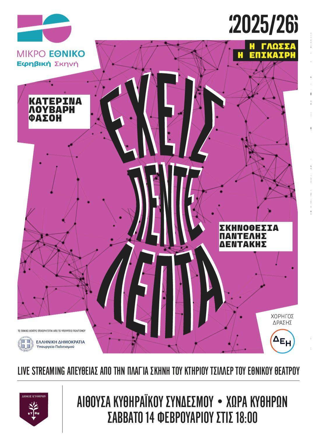 ΚύθηραΠολιτισμόςΗ θεατρική παράσταση “Έχεις 5 λεπτά” από την εφηβική σκηνή του Μικρού Εθνικού – Live Streaming στα Κύθηρα 14/2 Από Tsirigo FM30 Ιανουαρίου 202630.01.20260754 Πηγή: Ματίνα Βάρδα