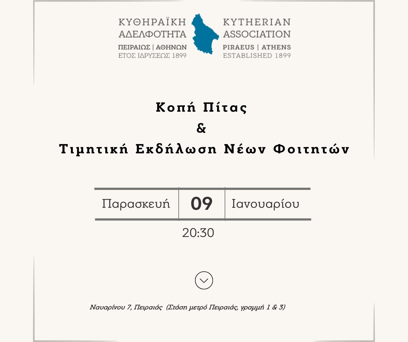 ΚοινωνίαΚύθηραΤιμητική εκδήλωση για τους νέους Κυθηρίους φοιτητές και κοπή πίτας στην Κυθηραϊκή Αδελφότητα Πειραιώς 9/1 Από Tsirigo FM6 Ιανουαρίου 202606.01.20260621 Πηγή: Κυθηραϊκή Αδελφότητα Πειραιώς