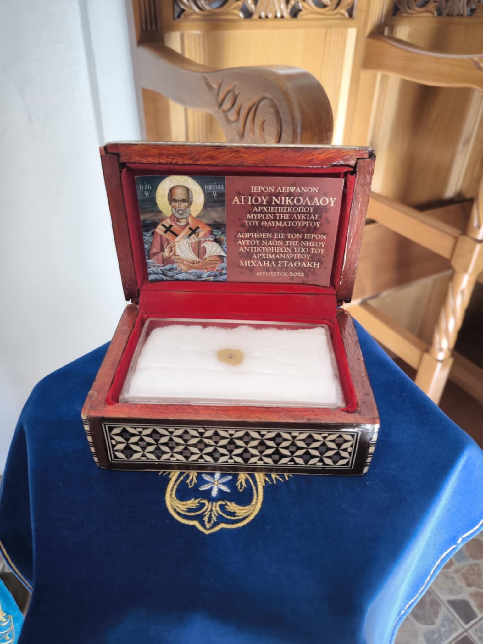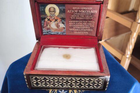 Από τη θάλασσα των Αντικυθήρων πέρασε τον 11ο αιώνα (1087) το μυροβλίζον Ιερό Σκήνωμα του μεγάλου Αγίου, όταν υπό τον φόβο συλήσεώς του, μετεφέρθη από τα Μύρα της Λυκίας στο Μπάρι της Ιταλίας όπου θησαυρίζεται μέχρι σήμερα. Μυροβλίζον απότμημα του Ιερού του Λειψάνου υπάρχει και στον ομώνυμο Ναό του στα Αντικύθηρα, δωρεά του Πανοσ. Αρχιμανδρίτου της Ιεράς Αρχιεπισκοπής Αθηνών π. Μιχαήλ Σταθάκη, προϊσταμένου του Ι. Ν. Αγ. Γεωργίου Νέου Ψυχικού.