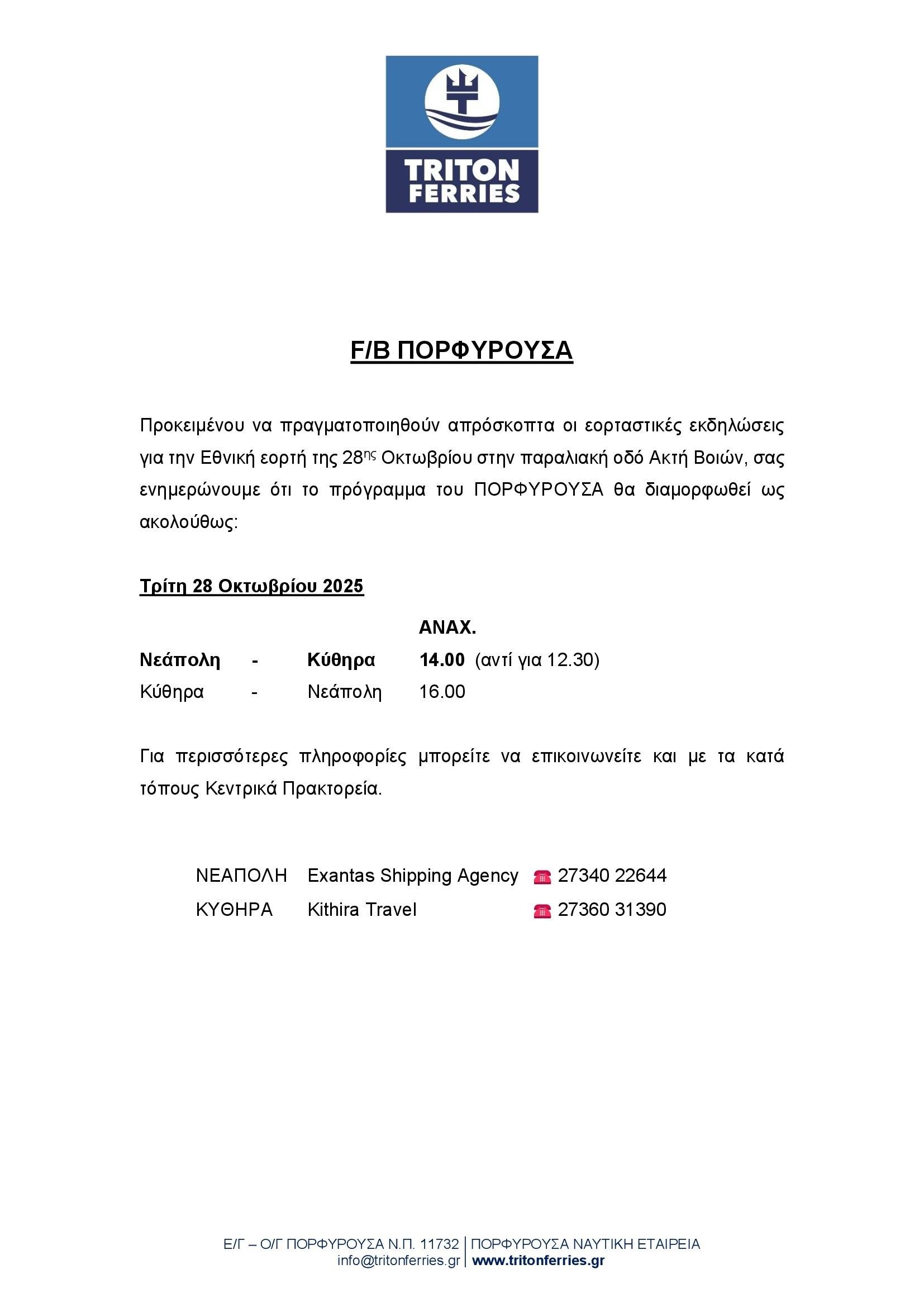 ΔρομολόγιαΚύθηραΤροποποίηση δρομολογίου Ε/Γ-Ο/Γ ΠΟΡΦΥΡΟΥΣΑ την Τρίτη 28 Οκτωβρίου Από Tsirigo FM17 Οκτωβρίου 20250500Πηγή: Μελίνα Τσαϊλά – TRITON FERRIES Φωτογραφία αρχείου Παναγιώτη Μπαχτή – TSIRIGO FM 105,6